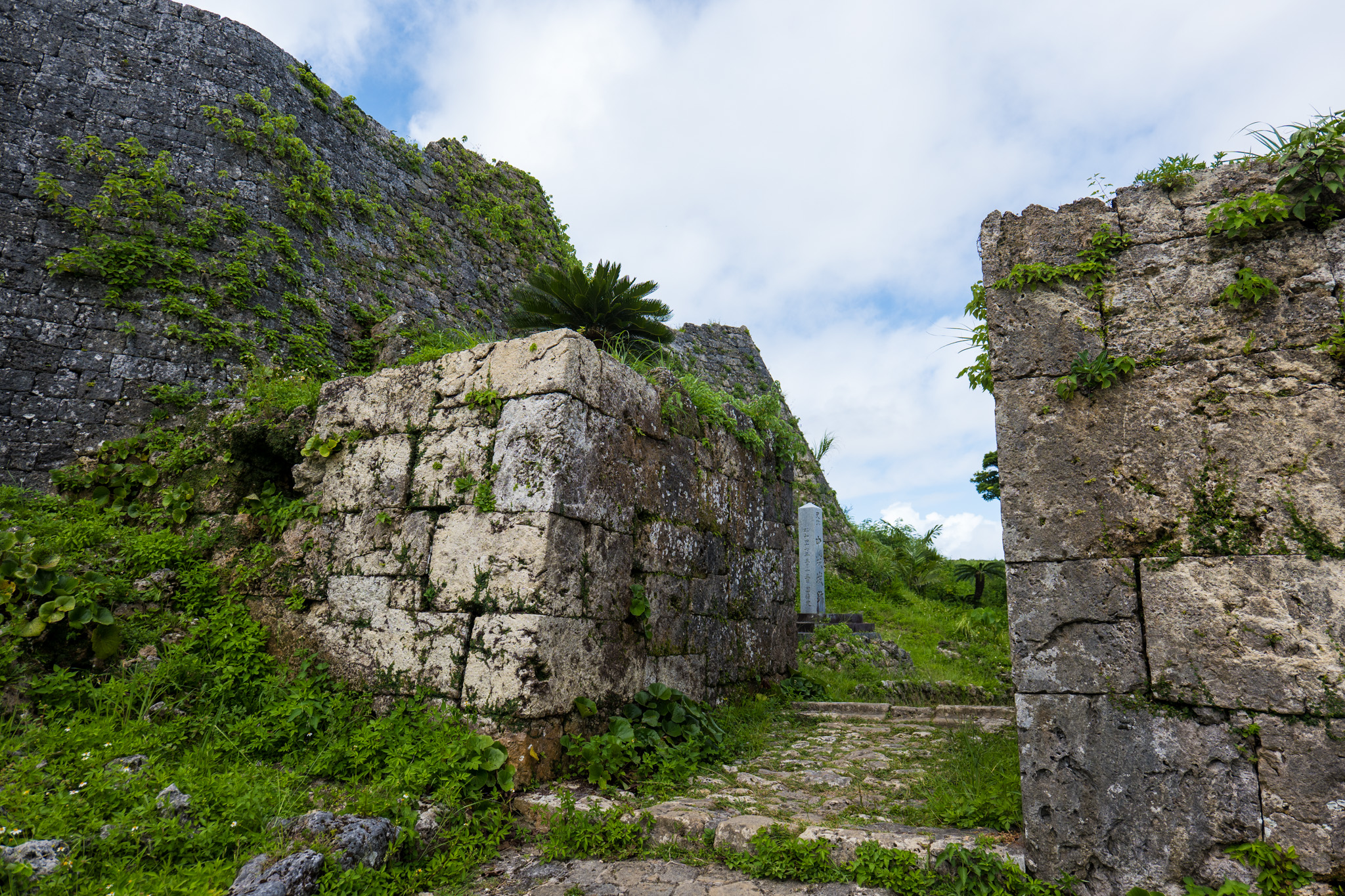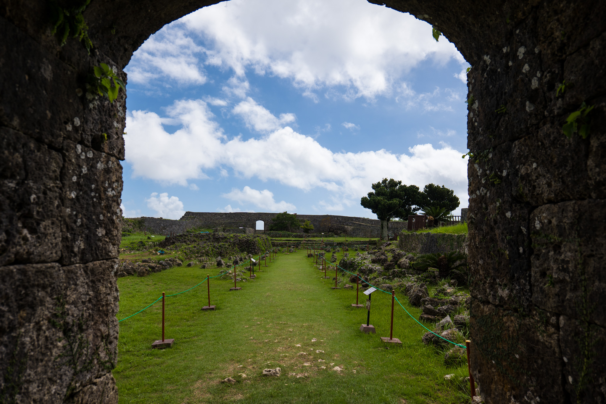 나카구스쿠 성터는 15세기 중반, 당시 북부를 통치하던 고사마루(護佐丸)가 확장한 것으로 알려져 있습니다. 류큐왕국 시대에는 군사 요충지인 동시에 행정 중심지의 역할까지 했습니다. 성벽은 오키나와 특유의 석조 기술로 쌓아 올렸는데, 이는 자연석을 그대로 쌓는 방식과 깎은 석재를 정교하게 맞추는 방식을 혼합한 것입니다.