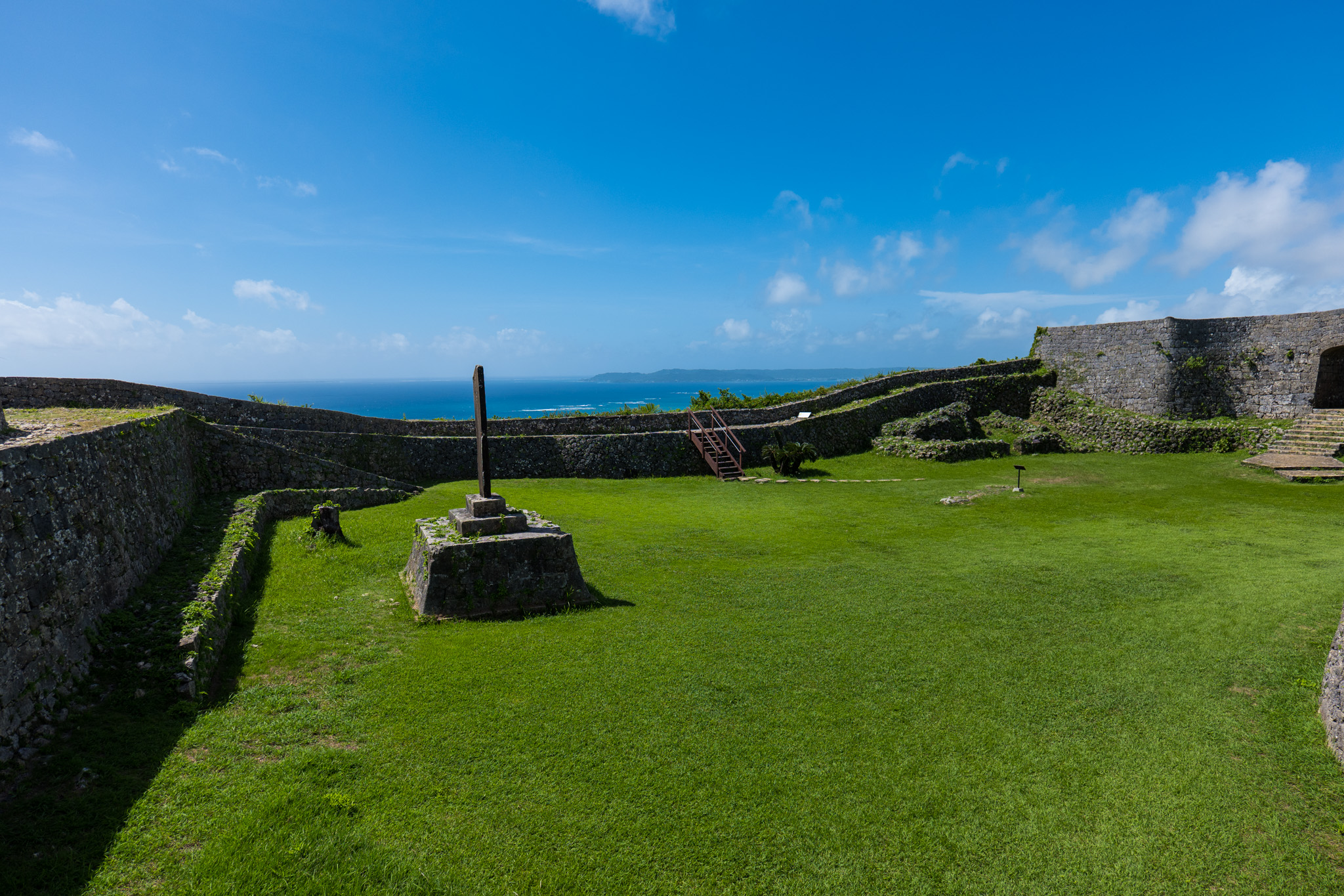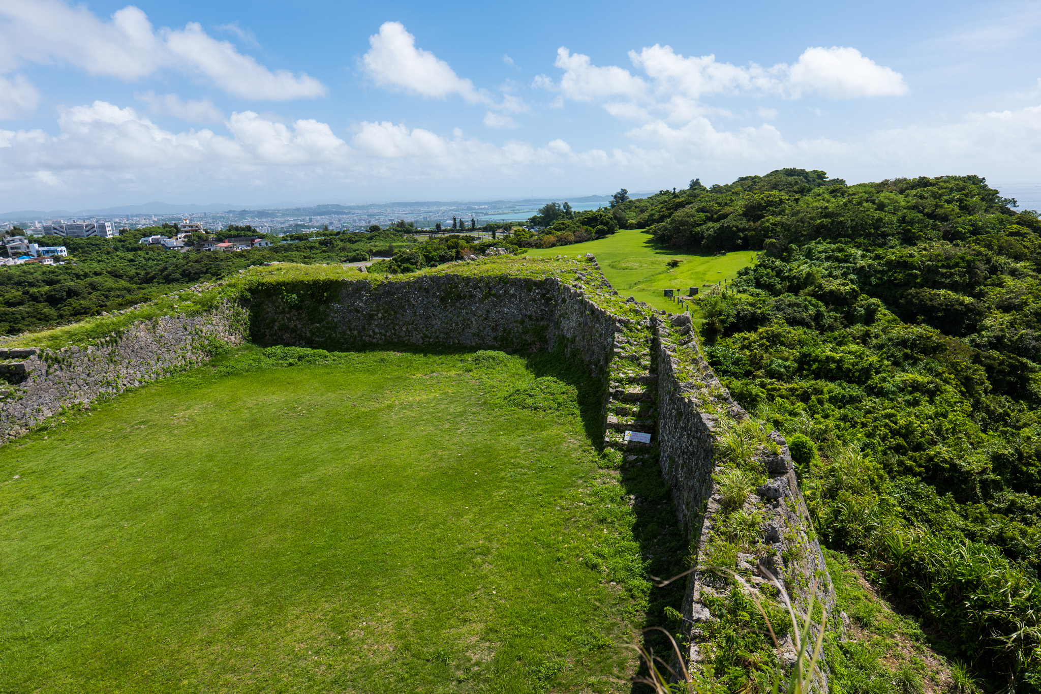 나카구스쿠 성터는 해발 150~170m 석회암 언덕에 세워져 있습니다. 성벽 위로 오르면 동서남북으로 파노라마가 펼쳐집니다. 특히 우루마시 방향으로 코발트 블루 바다가 시원하게 펼쳐집니다. 맑은 날에는 해중도로와 이케이섬까지 내다보입니다.