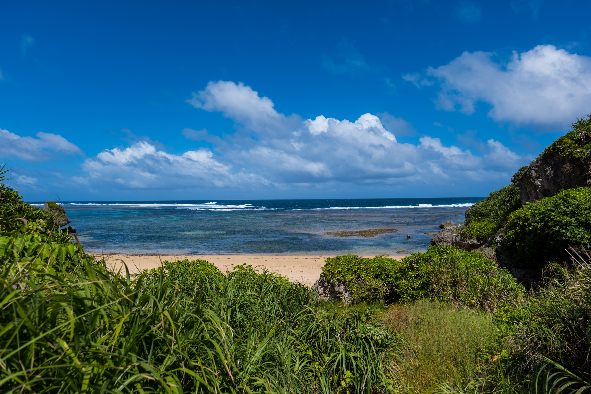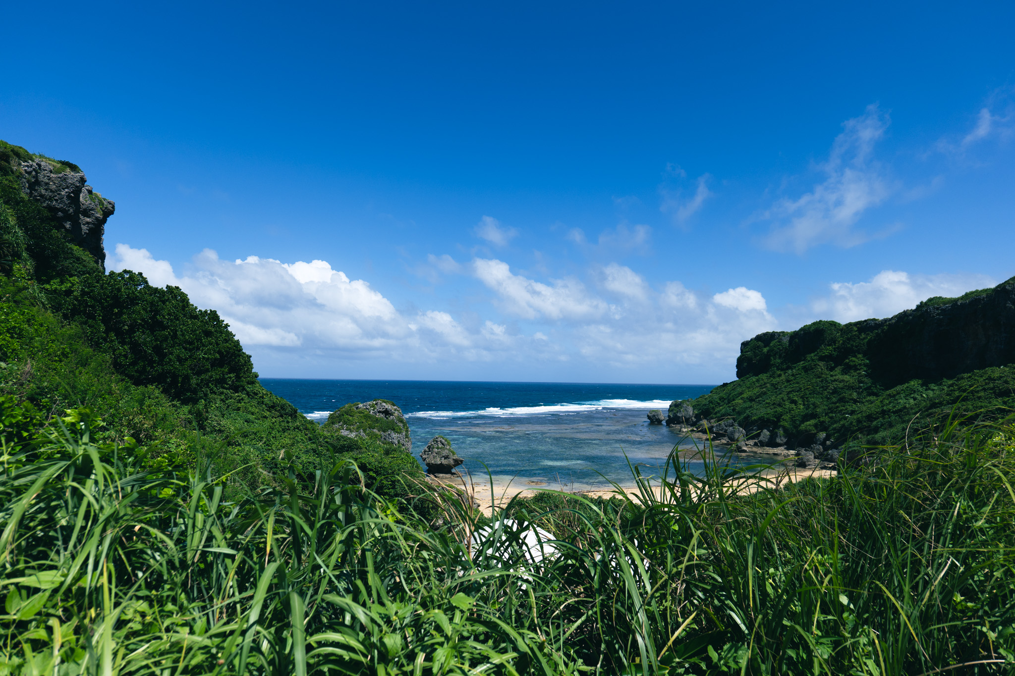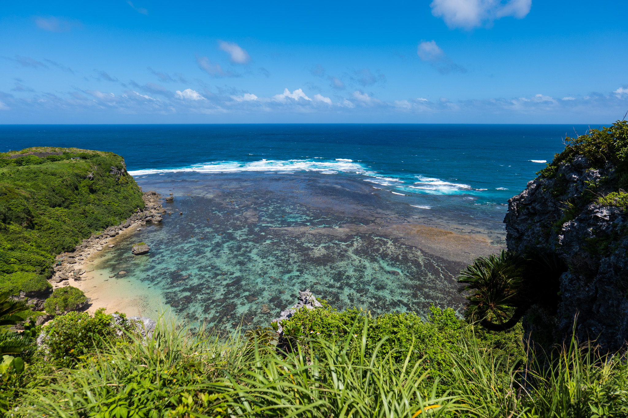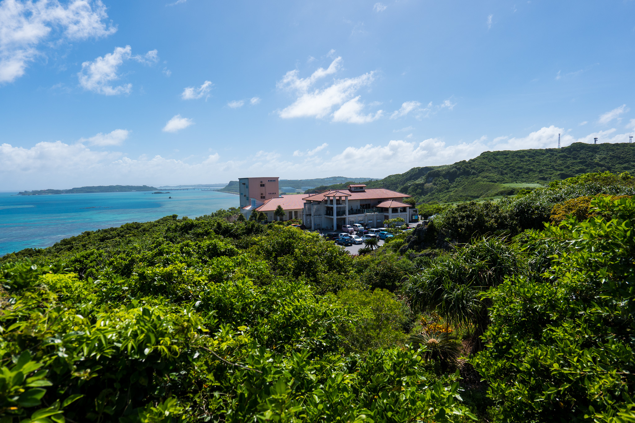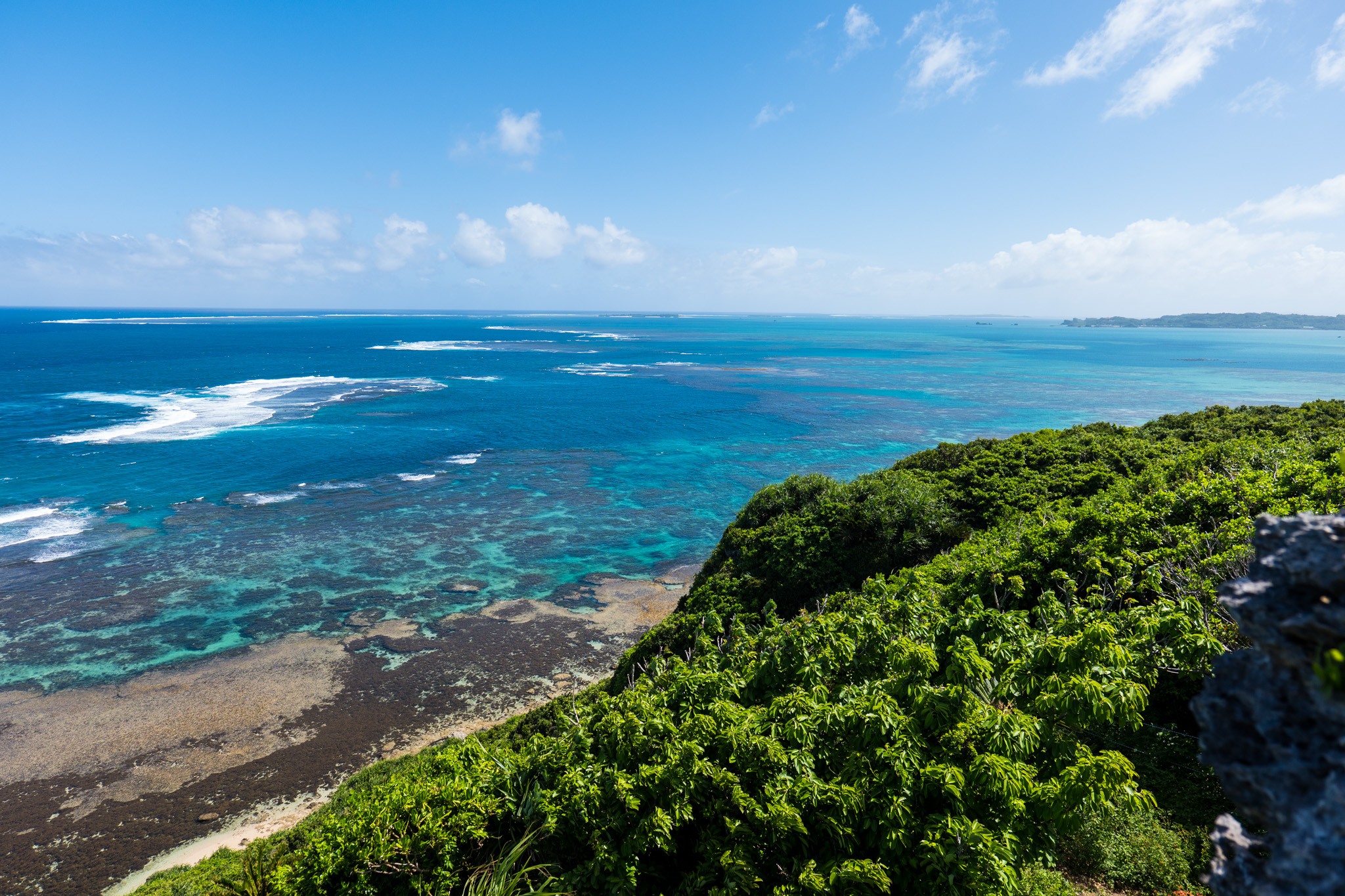 - 누치마스 소금공장 주차장에서 완만한 언덕길을 오르면 갑자기 시야가 트이며 태평양이 파노라마처럼 눈에 들어옵니다. 내려다보면, 섬 주변 산호초 지대가 선명하게 보입니다.