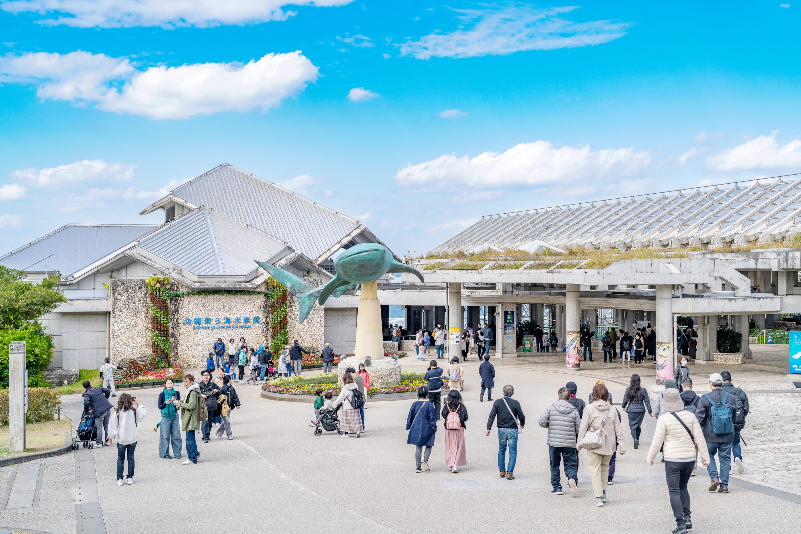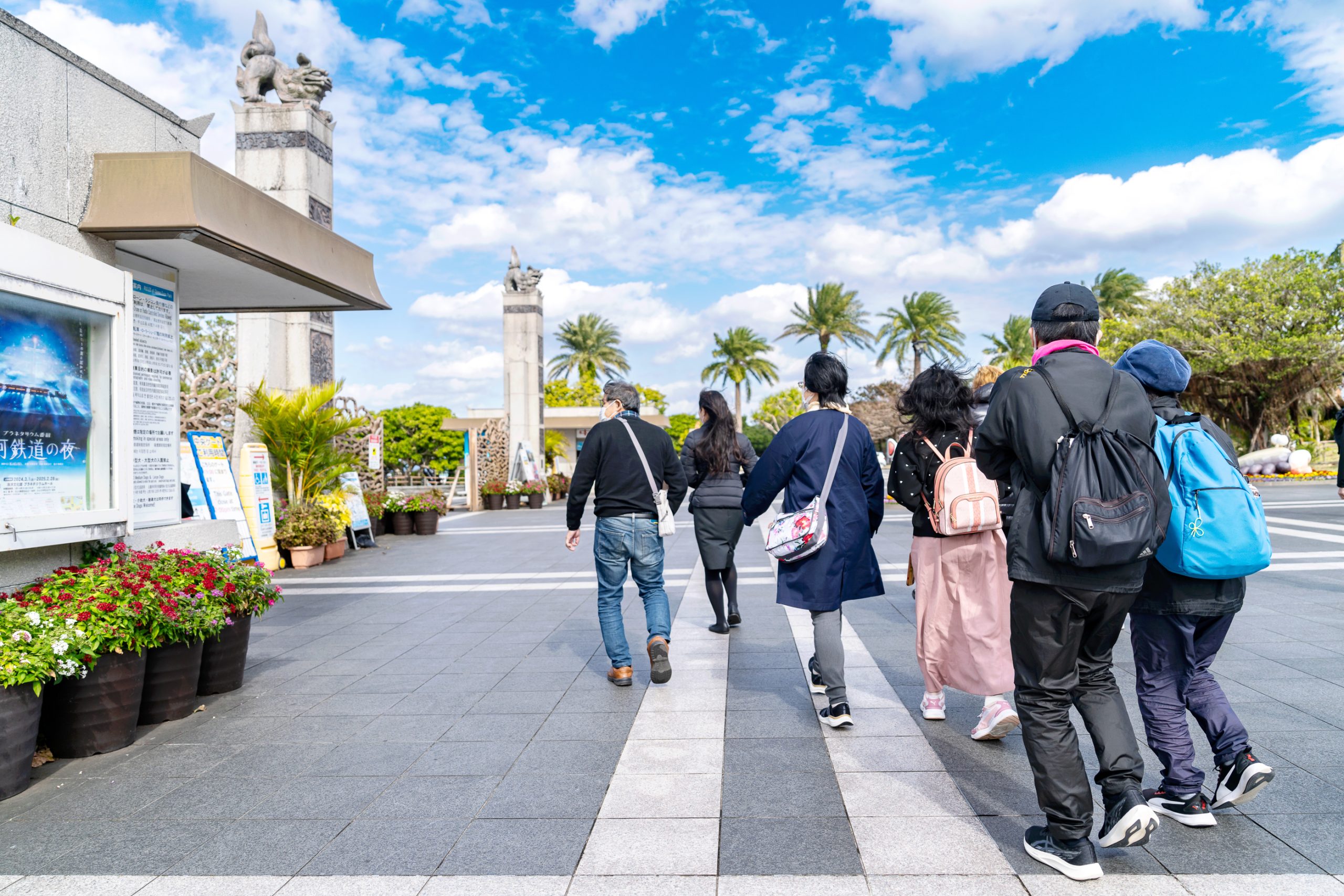 츄라우미 수족관은 주차장과 거리가 대략 500미터 정도 떨어져 있어서 안내원이 인솔을 해줍니다. 오른족 사진처럼 잘 따라가시면 됩니다. 대략 이곳에 도착하는 시간은 오후 1시에서 1시 30분 사이라고 하는데요, 떠나는 시간은 오후 3시 30분입니다. 식사를 즐기고 수족관을 관람하고 오키쨩 돌고래쇼를 구경하기에 딱 맞는 시간입니다. 돌고래 쇼가 오후 3시 시작이니 분배를 잘 하셔서 구경하시면 됩니다!