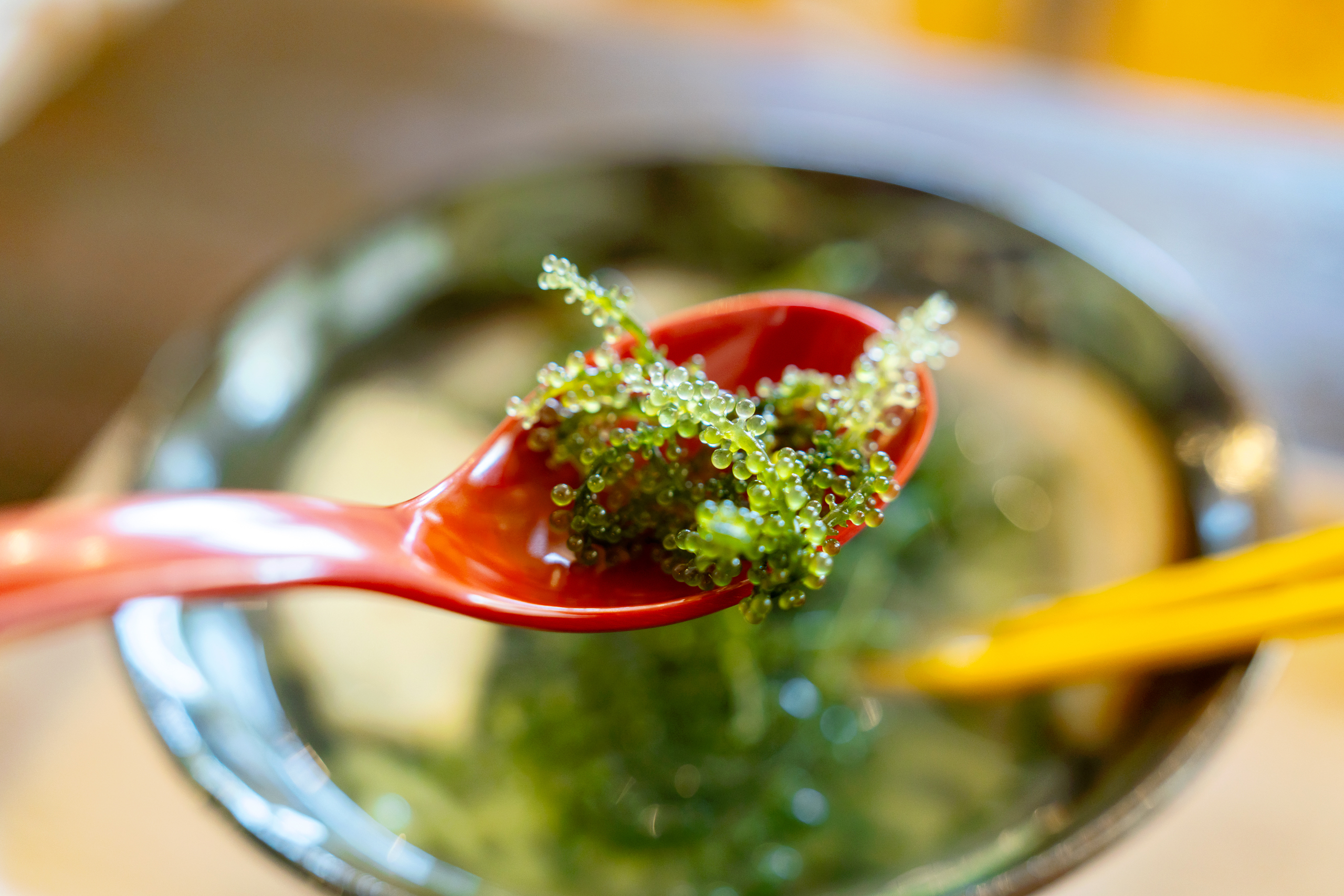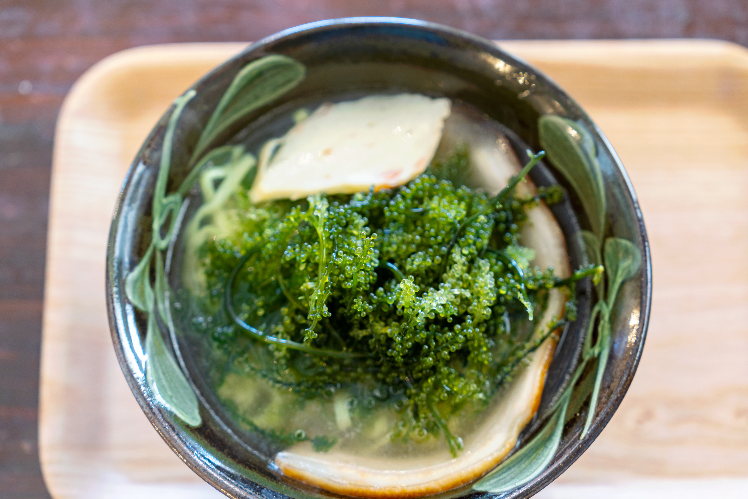 아마 여러분이 한국에서는 경험해보지 못했을 그런 식감의 독특한 바다포도와 오키나와 소바가 함께하기 때문에 이국적인 식단입니다. 가격은 1,300엔으로 일반적인 오키나와소바보다 훨씬 비싼데, 바다포도 자체가 비싼 식재료이기 떄문입니다.