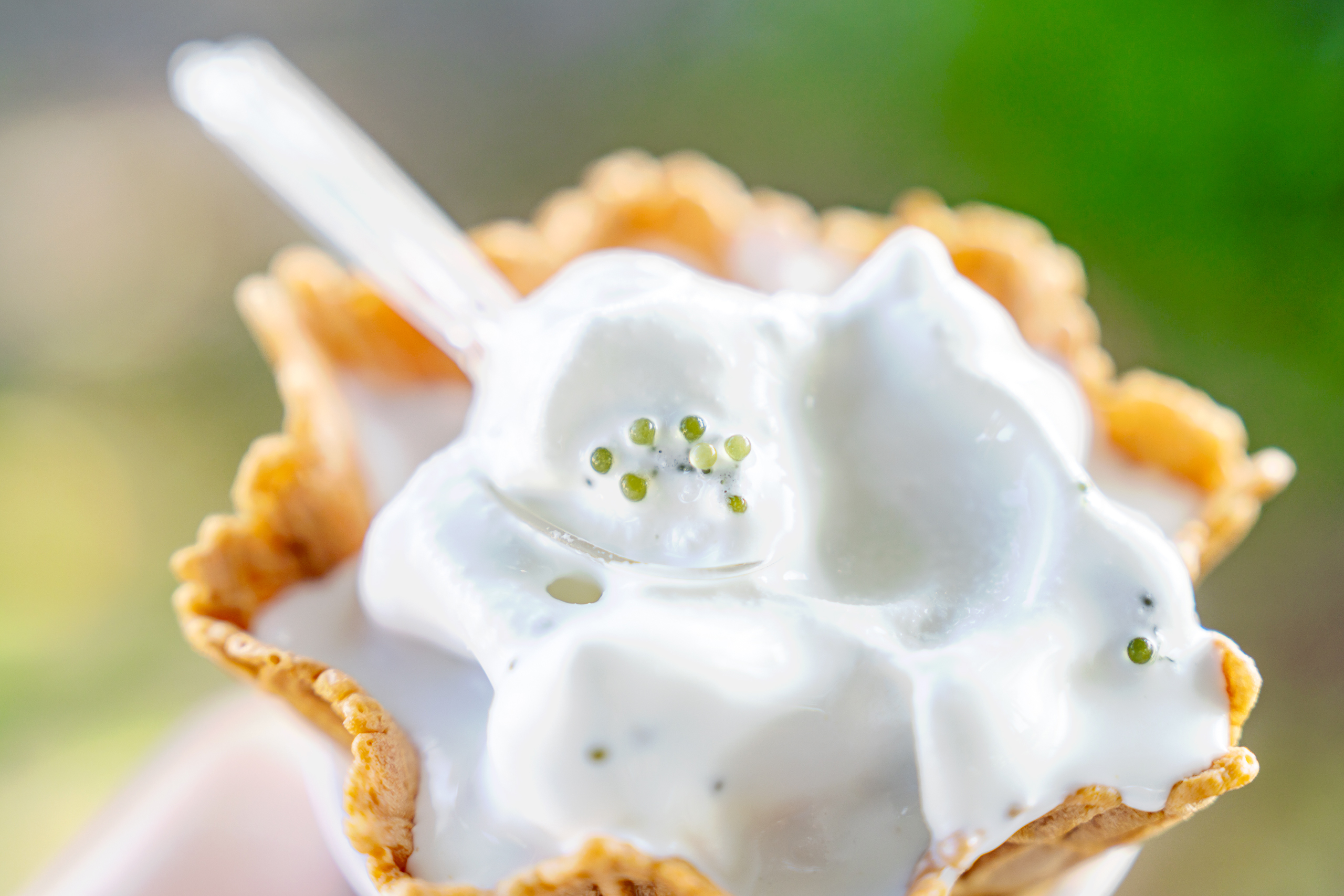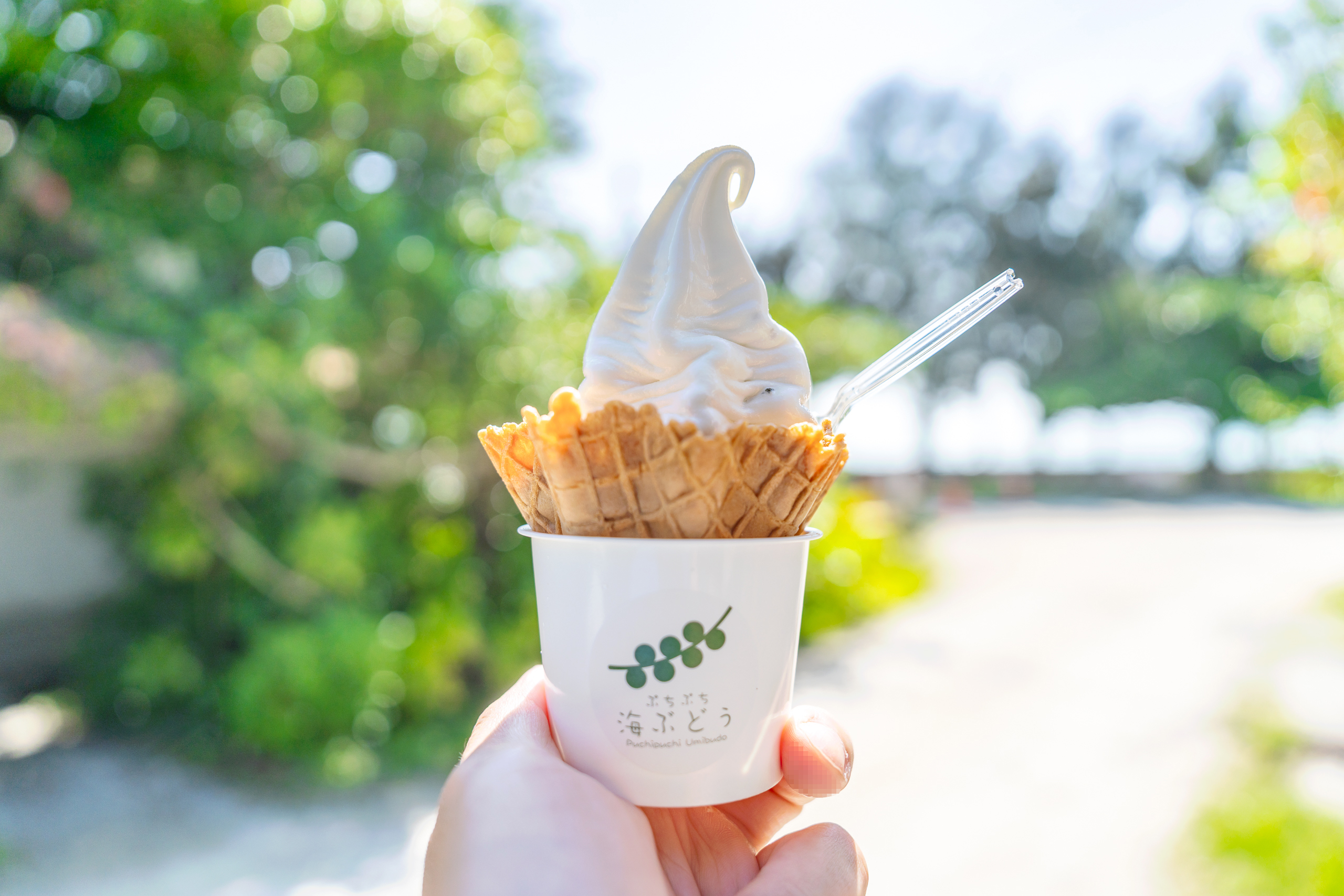 아이스크림에 우미부도가 들어 있어서, 톡톡 튀는 식감을 아이스크림에서도 즐길 수 있어요. 바로 옆이 해변이고, 앉을 수 있는 공간이 있으니 그늘에 앉아 바다보며 바다포도를 즐기는 것도 괜찮은 여유를 즐기는 방법이라고 생각해요.