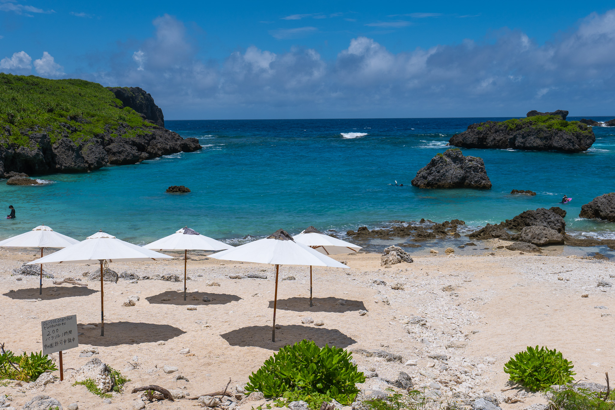 - 토구치노하마: 이라부지마 남쪽, 해안선을 따라 활처럼 펼쳐진 곱고 새하얀 모래사장을 가진 천연 비치