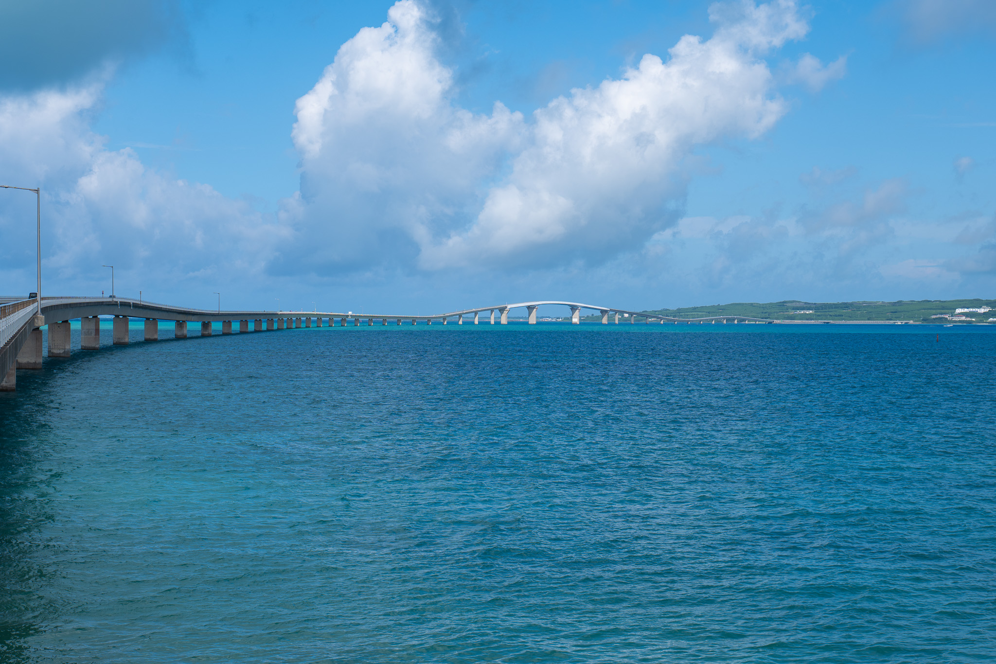 시모지시마 공항에서 해안 도로를 따라 달리다가 보면 미야코 블루 위로 이라부대교가 나타납니다. 장엄한 곡선을 그리는 다리가 눈앞에 펼쳐지는데요, 보는 것만으로도 감동 그 자체입니다.