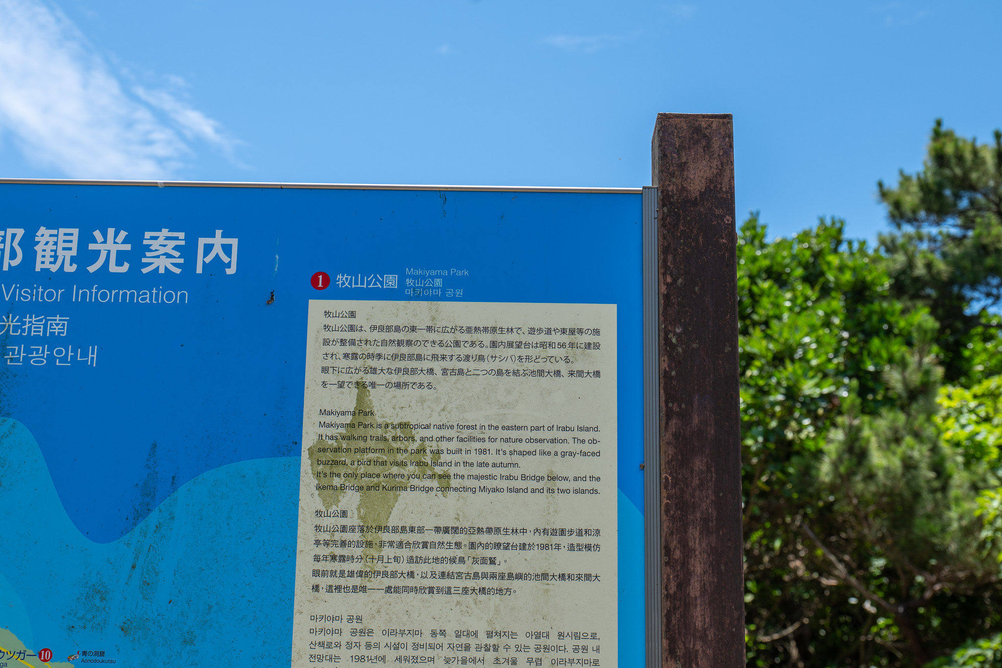 마키야마 전망대는 그 자체가 포토존이에요. 특히 미야코 블루를 가로지르는 이라부대교가 한눈에 들어오는 구도는 정말 황홀할 정도로 멋지답니다. 시모지시마에서 이라부대교를 건너기 전, 잠깐 들러보기에도 좋고요. 반대로 미야코지마에서 이라부지마와 시모지시마로 나들이 갈 때도 그 시작으로 참 좋아요.