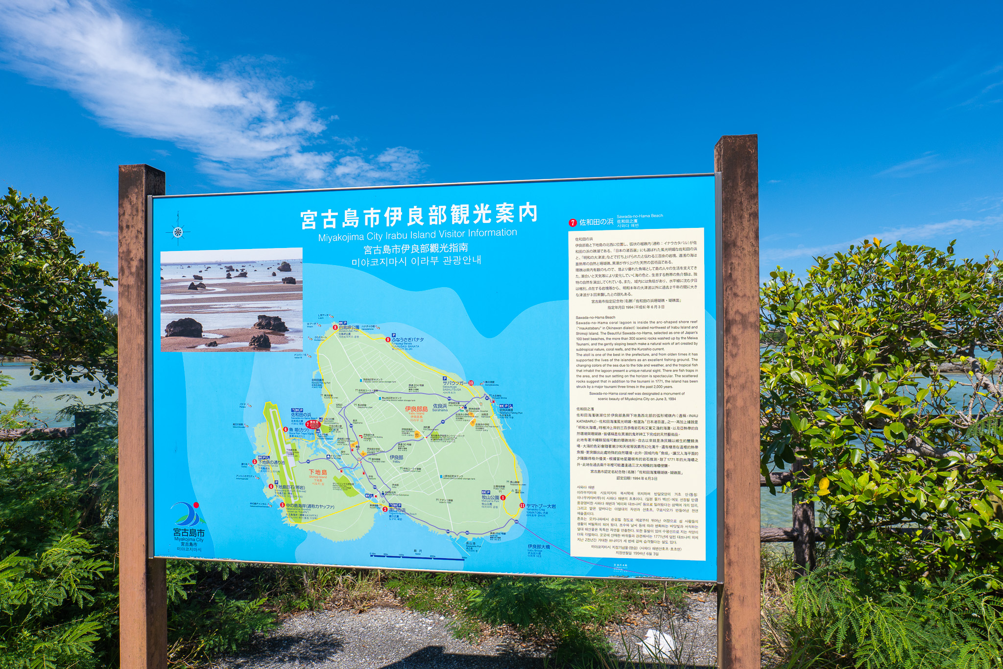 사와다노하마는 인천공항에서 직항으로 연결된 시모지시마 공항에서 차로 5분 거리에 있어요. 사와다노하마는 이라부지마와 시모지시마가 사이에 좋게 만나는 북서쪽 끝 해변입니다. 이곳은 시모지시마와 이라부지마가 좁은 수로를 끼고 인접해 있으며, 라군이 발달해 있어요