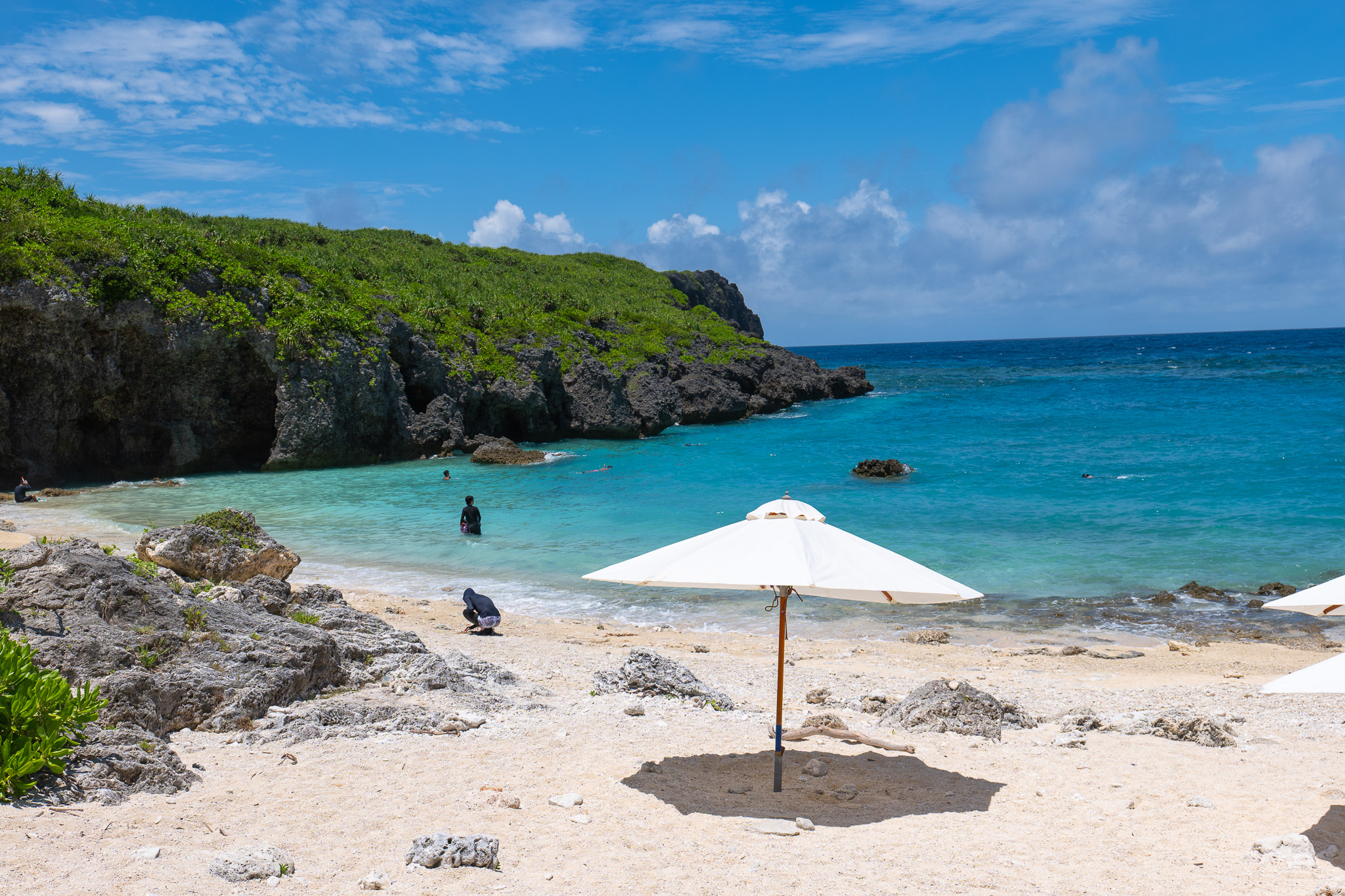 사와다노하마는 이라부지마 북서쪽에 위치한 천연 비치예요. 높은 투명도 새하얀 모래사장, 잔잔한 바다에 무수한 바위가 흩어져 있는 환상적인 풍경으로 일본 100대 해변으로 선정되기도 했어요. 특히 일몰은 절경으로 알려져 있어요.