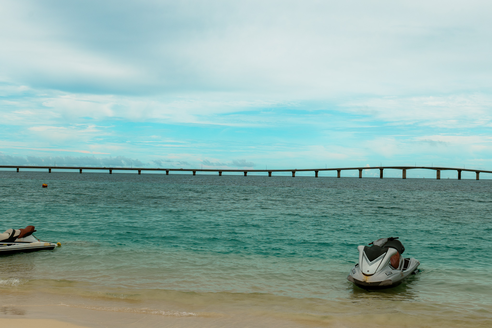 주차장에서 모래사장으로 발을 옮기면, 왼쪽으로 쿠리마대교가 보이고, 오른쪽으로는 줄지어 늘어선 파라솔들이 눈에 들어옵니다. 그 너머엔 투명하게 반짝이는 미야코 블루 바다가 아름다운 그라데이션을 그리고 있죠.
